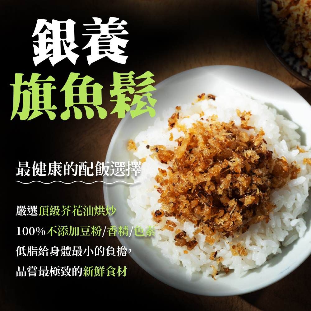 • 選用體型超過100kg的大白旗魚去除雜質,只挑選1/5部位生魚片等級,先用魚大骨高湯川燙魚肉後再加上芥花油大火烘炒,品質特優。